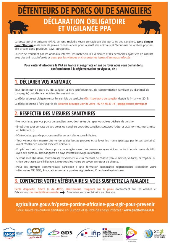 Conformément à la règlementation en vigueur et pour éviter d’introduire la PPA en France, les détenteurs de porcs ou de sangliers doivent déclarer leurs animaux.